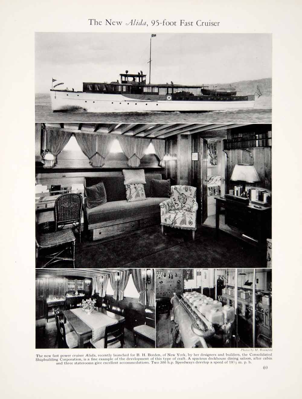 This is an original 1928 black and white halftone print of interior and exterior views of the 95-foot cruiser yacht Alida, that was designed and built by the Consolidated Shipbuilding Corporation for B.H. Borden.