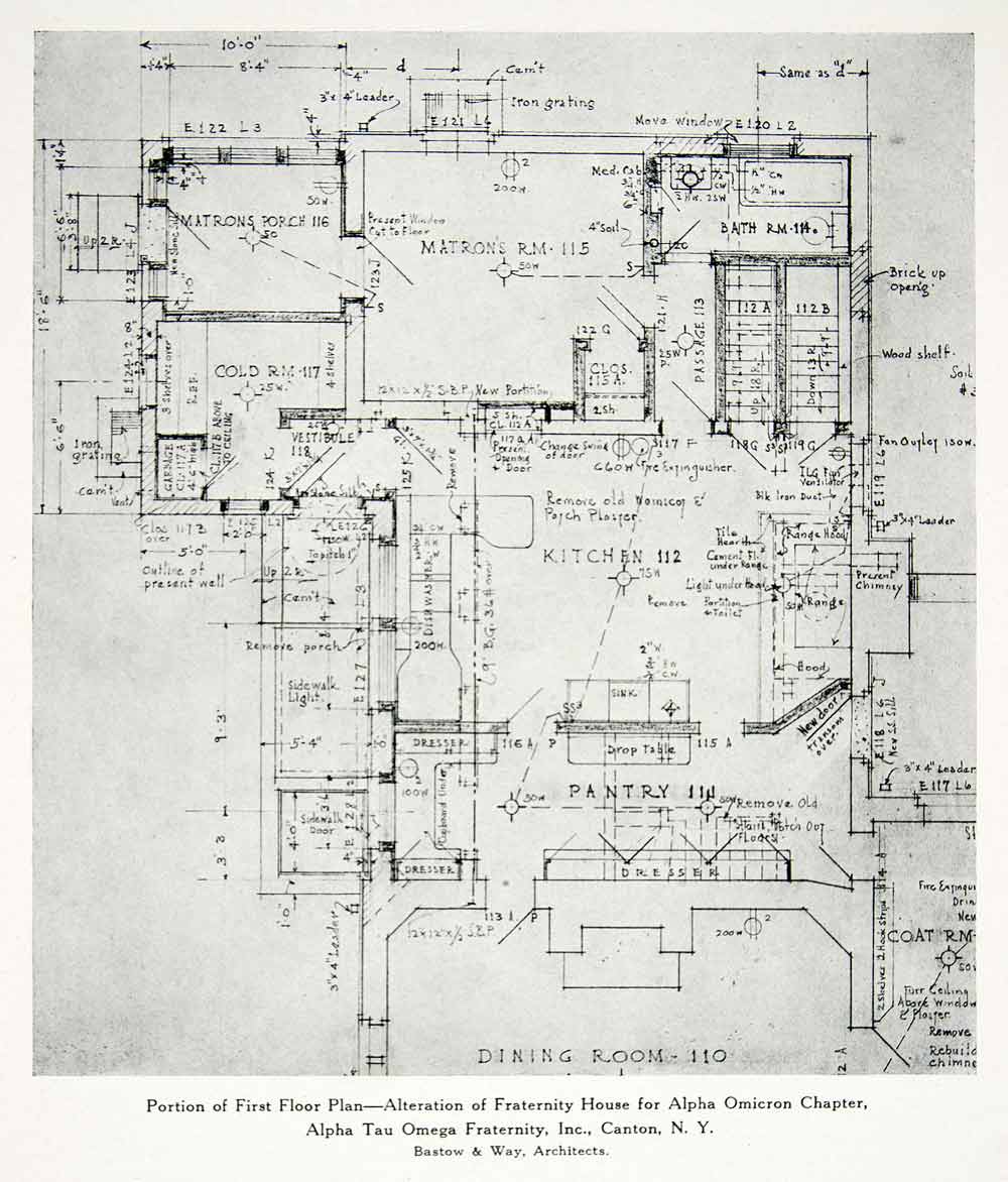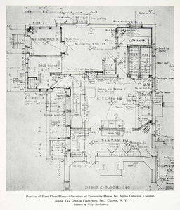 This is an original 1928 black and white halftone print of an architectural blueprint of the first floor plan for the alteration of the fraternity house for the Alpha Omicron Chapter of the Alpha Tau Omega Fraternity in Canton, New York. Architecture courtesy of Bastow and Way.