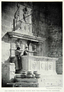 This is an original 1928 black and white halftone print of an ancient fountain carved in stone at the Italian town of Assisi.