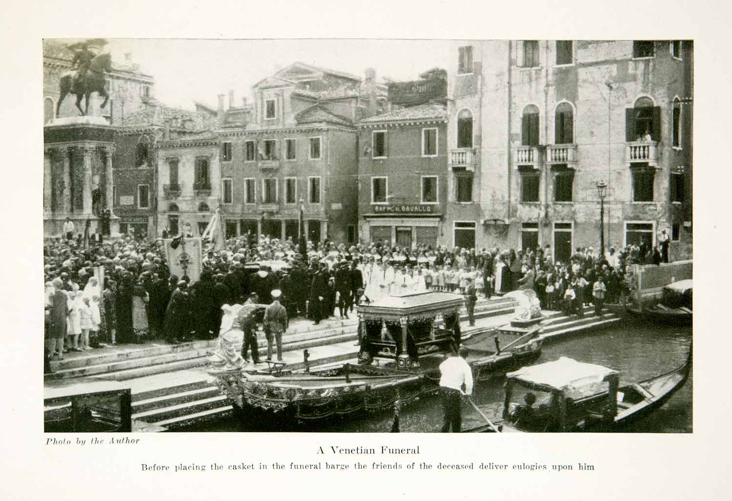 This is an original 1928 duotone halftone print of a Venetian funeral procession where the casket of the deceased is placed in a gondola on the "funeral barge," also known as the Canal of the Beggars or the barca funebre in Italy.