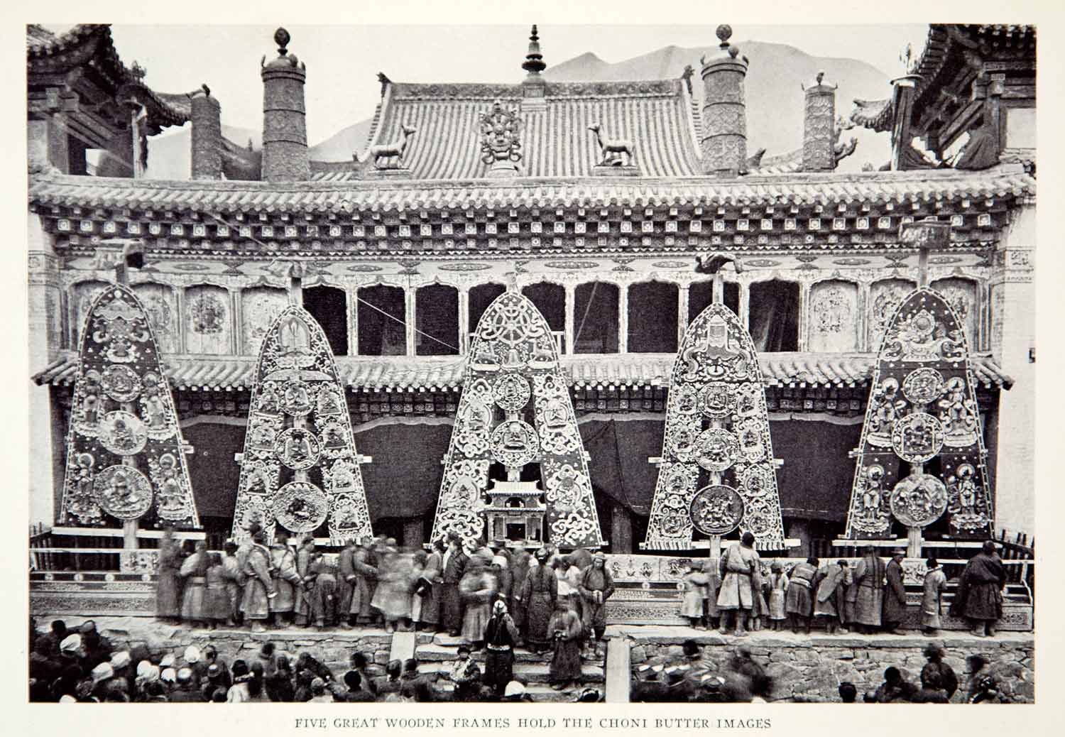 This is an original 1928 black and white halftone print of giant wooden panels created by Choni monks during the Butter Festival in China.
