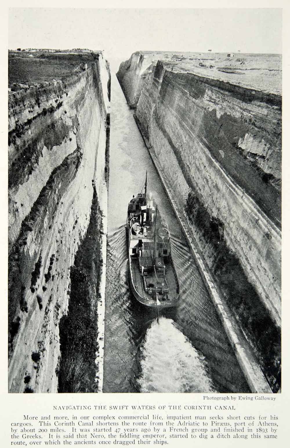 This is an original 1928 black and white halftone print of a ship passing through the Cornith Canal in Greece.