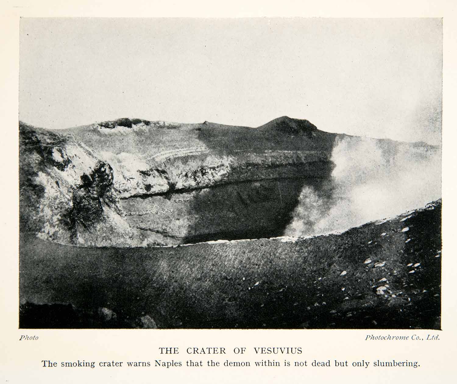 This is an original 1928 black and white halftone print of the crater of Mount Vesuvius near the city of Naples, Italy.