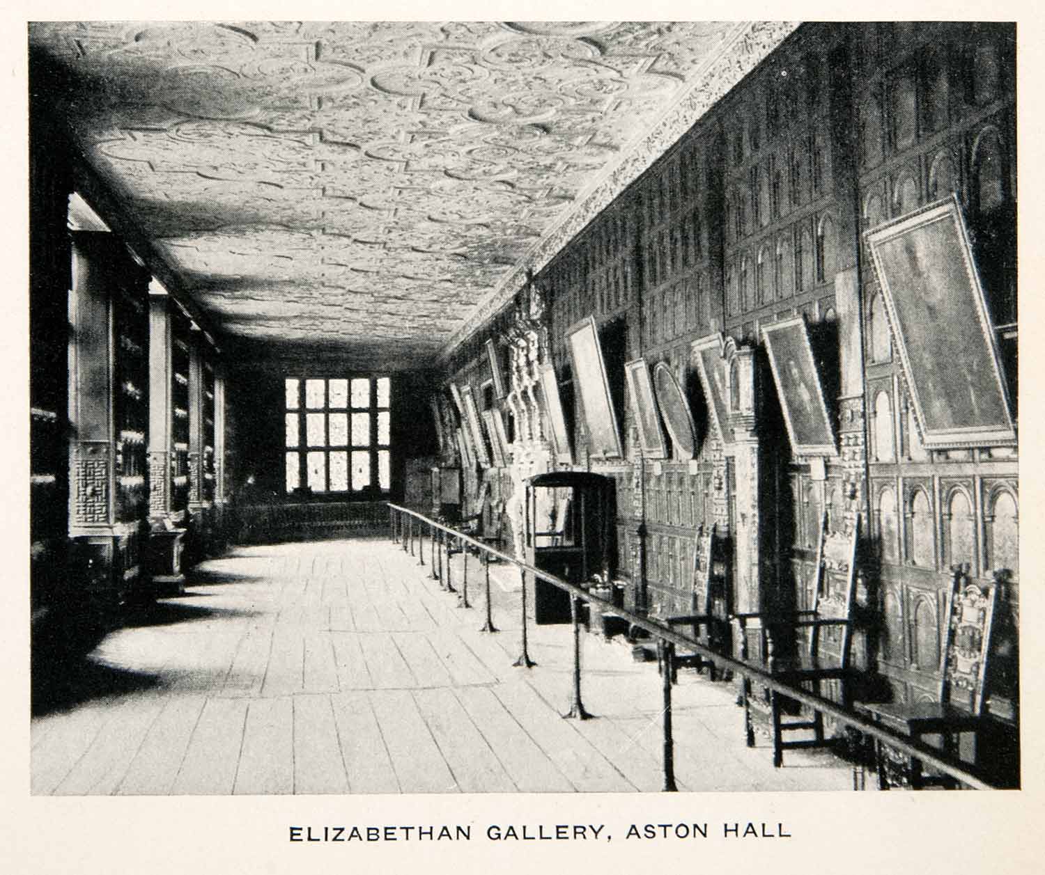This is an original 1928 black and white halftone print of "Elizabethan Gallery, Aston Hall," in England.