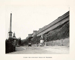 This is an original 1928 black and white halftone print of the road beneath the shadow of the Etruscan Walls in the city of Volterra, Italy.