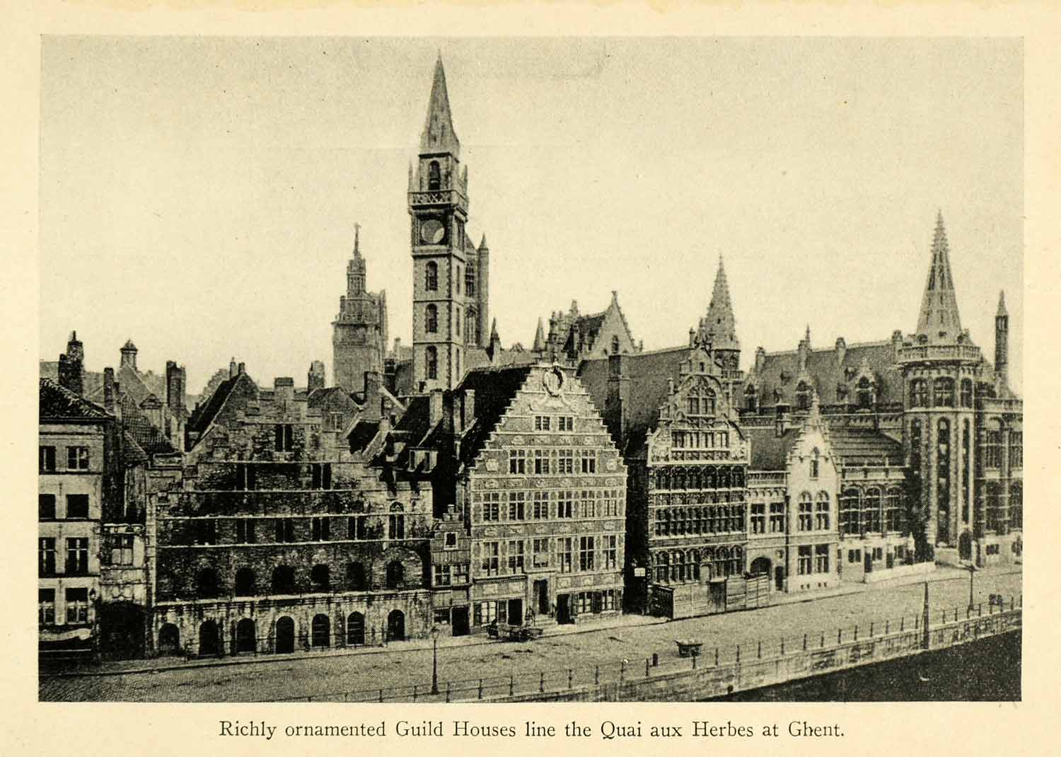 This is an original 1928 halftone print of the Guild houses that line the Quai aux Herbest in Ghent, Belgium. The Ghent Belfry is also visible in this image, which was designated a UNESCO World Heritage Site in the late 1990s.