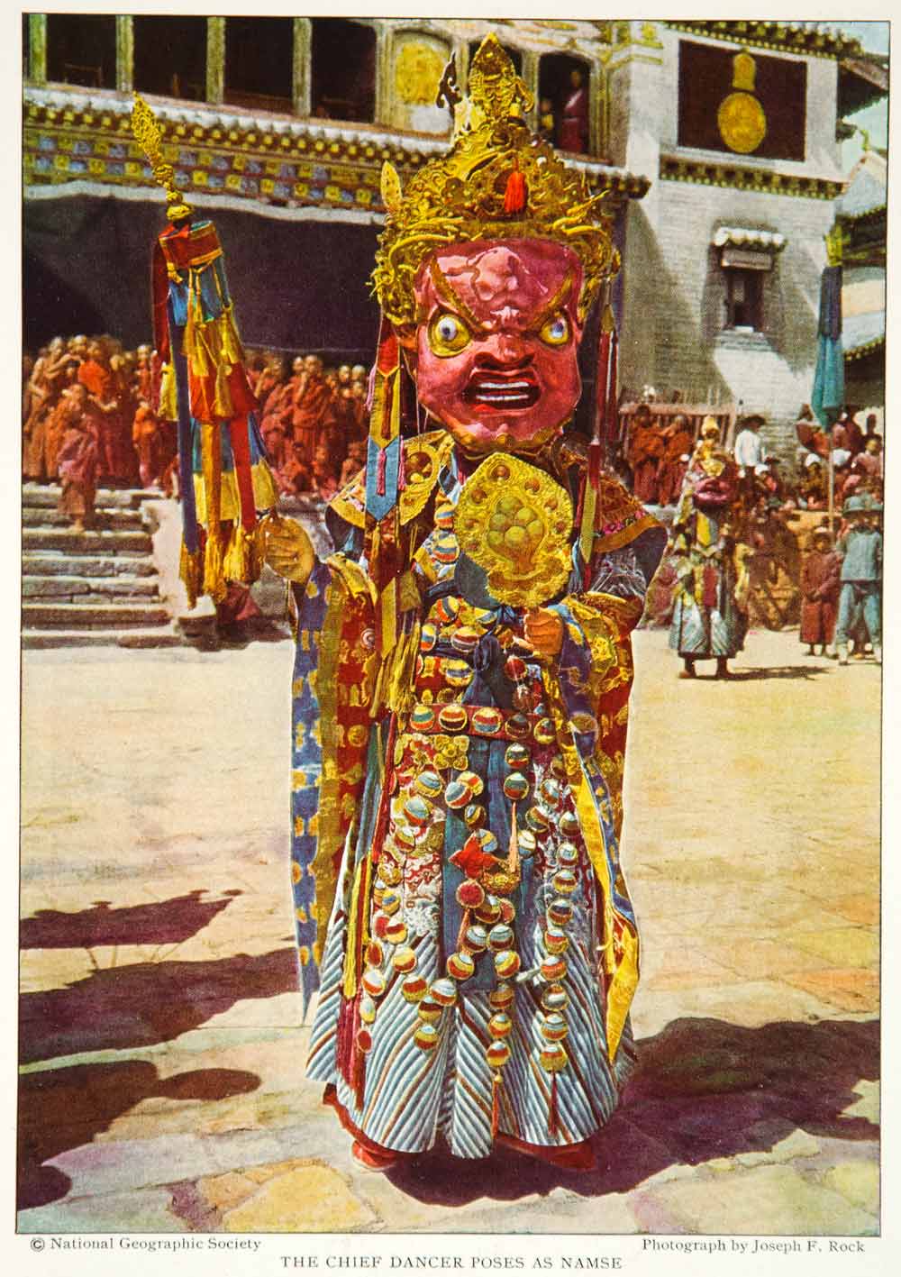 This is an original 1928 color halftone print a Tibetan dancer dressed as Namsem, the God of Wealth.