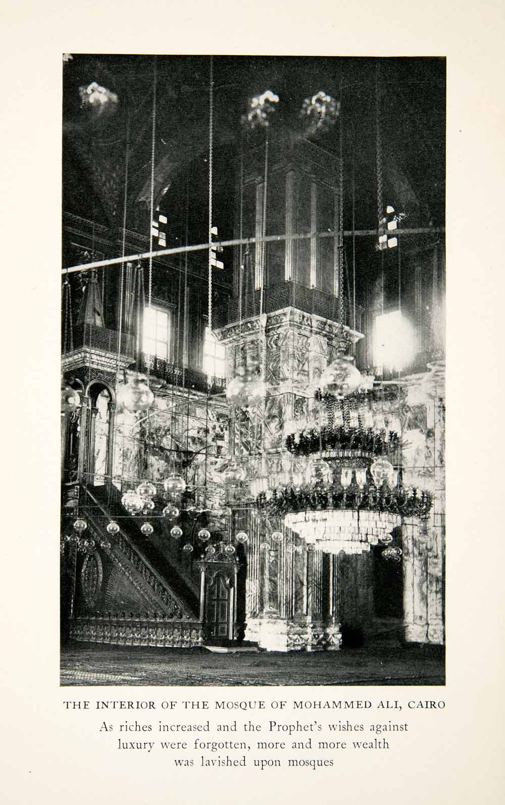 This is an original 1928 black and white halftone print of the interior of the Mosque commissioned by Mohammed Ali Pasha, in the Citadel of Cairo.