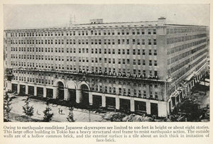 This is an original 1928 halftone print of a Japanese office building in Tokyo, Japan. Due to earthquake conditions Japanese skyscrapers are limited to 100 feet in height or about eight stories.