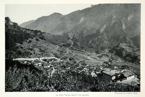 This is an original 1928 black and white halftone print of a small village in valley of the Litang River in Szechwan, China.