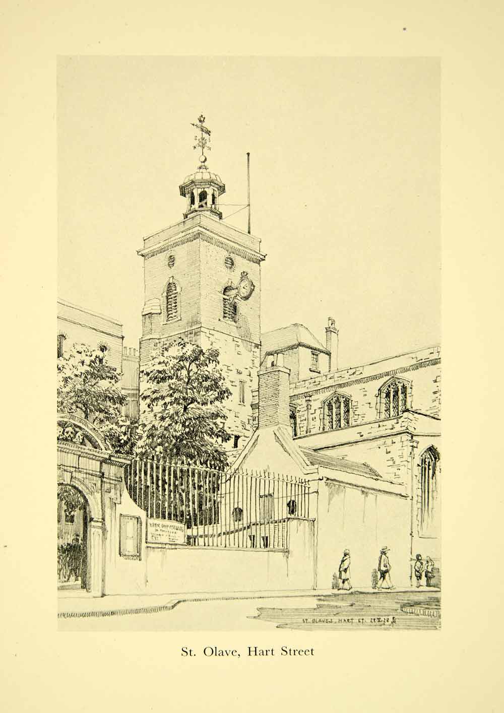 This is an original 1928 black and white halftone print of St. Olave's Anglican Church located on the corner of Hart Street and Seething Lane in the city of London, England. Among those buried in its cemetery are Mother Goose and Mary Ramsay (the woman suspected to have brought the Black Death to the city in the 17th Century CE).