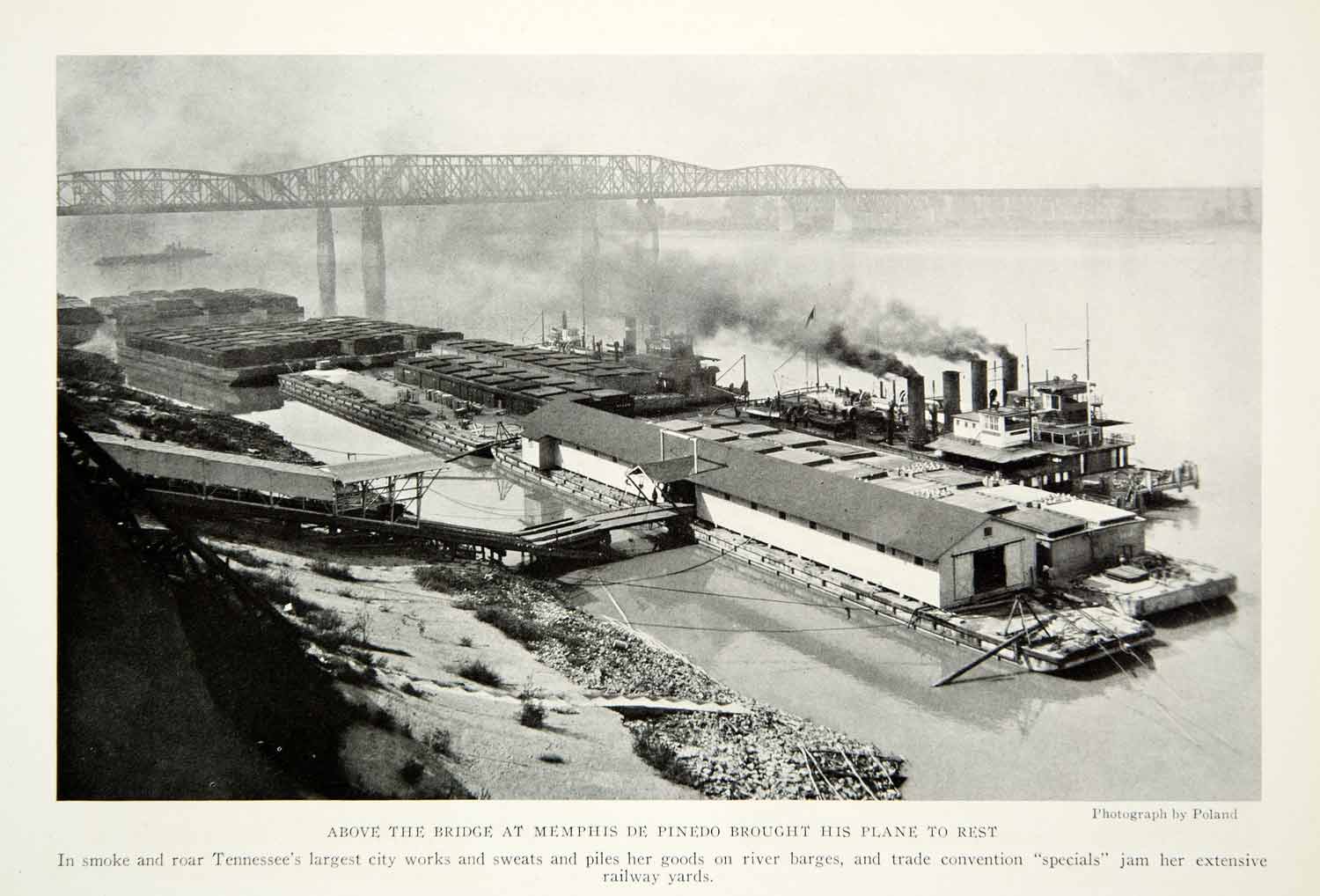 This is an original 1928 black and white halftone print of the bridge at Memphis crossing the Mississippi River behind a group of barges being loaded with goods.