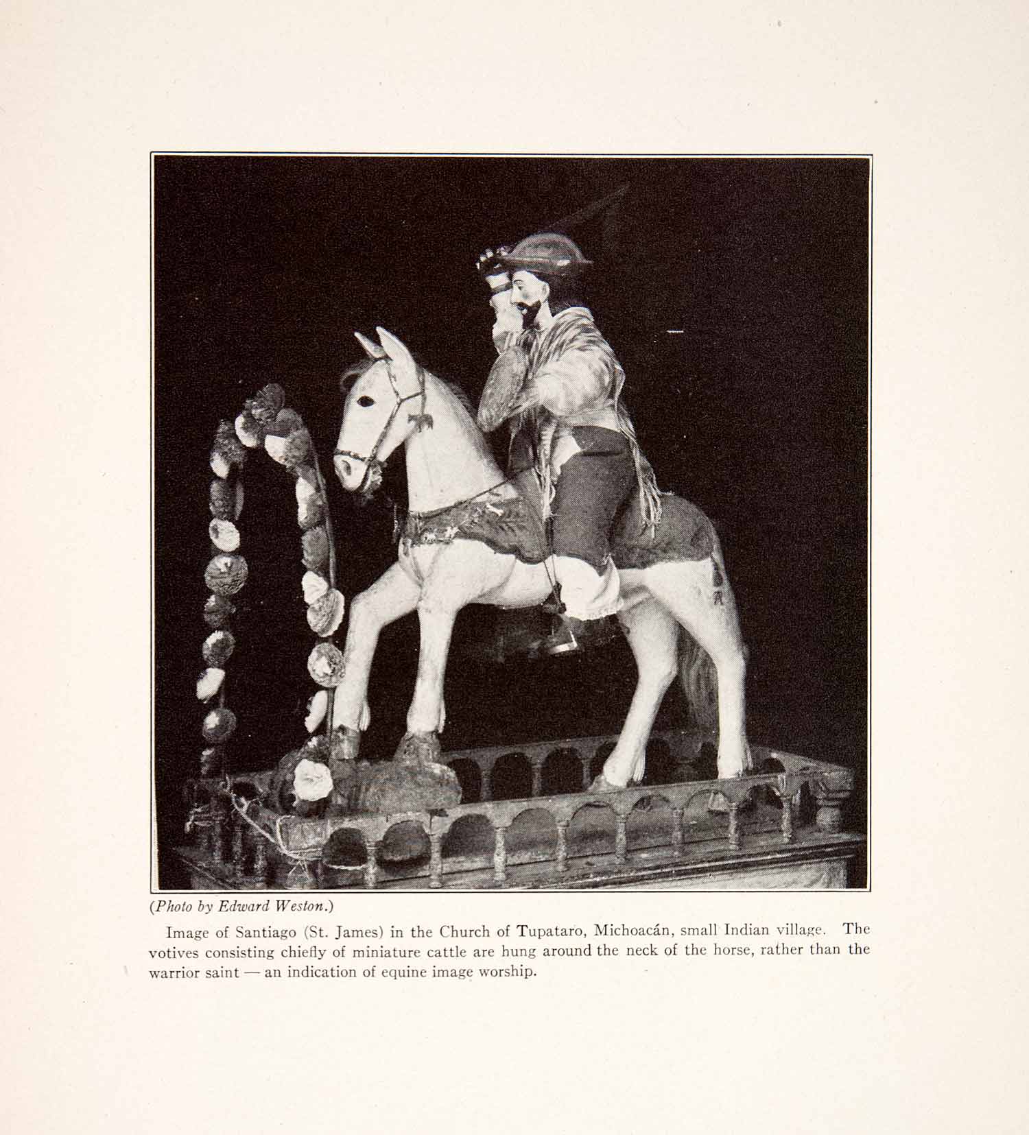 This is an original 1928 black and white halftone print of a sculpture Saint James riding his horse. This sculpture resides in the Church of Tupataro Michoacan. Saint James, or Santiago, is the Patron Saint of Spain.