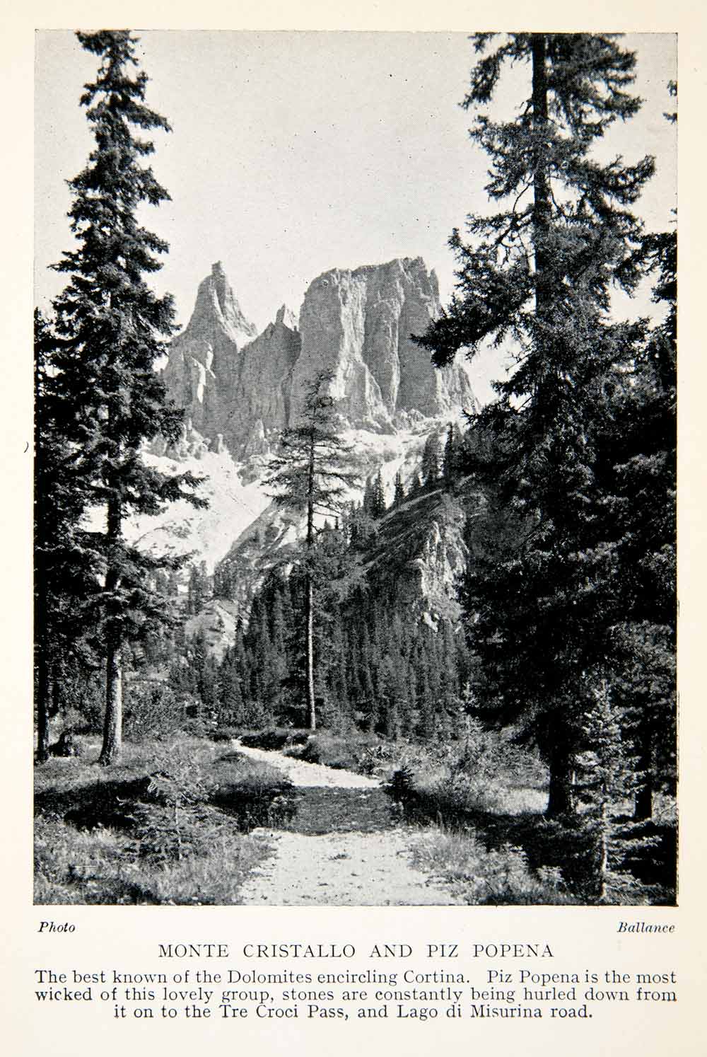 This is an original 1928 black and white halftone print of the mountain group called Cristallo which is located in the Dolomites mountain in northern Italy. Cristallo is northeast of Cortina d'Ampezzo. The highest peaks in this group are Piz Popena and Monte Cristallo.