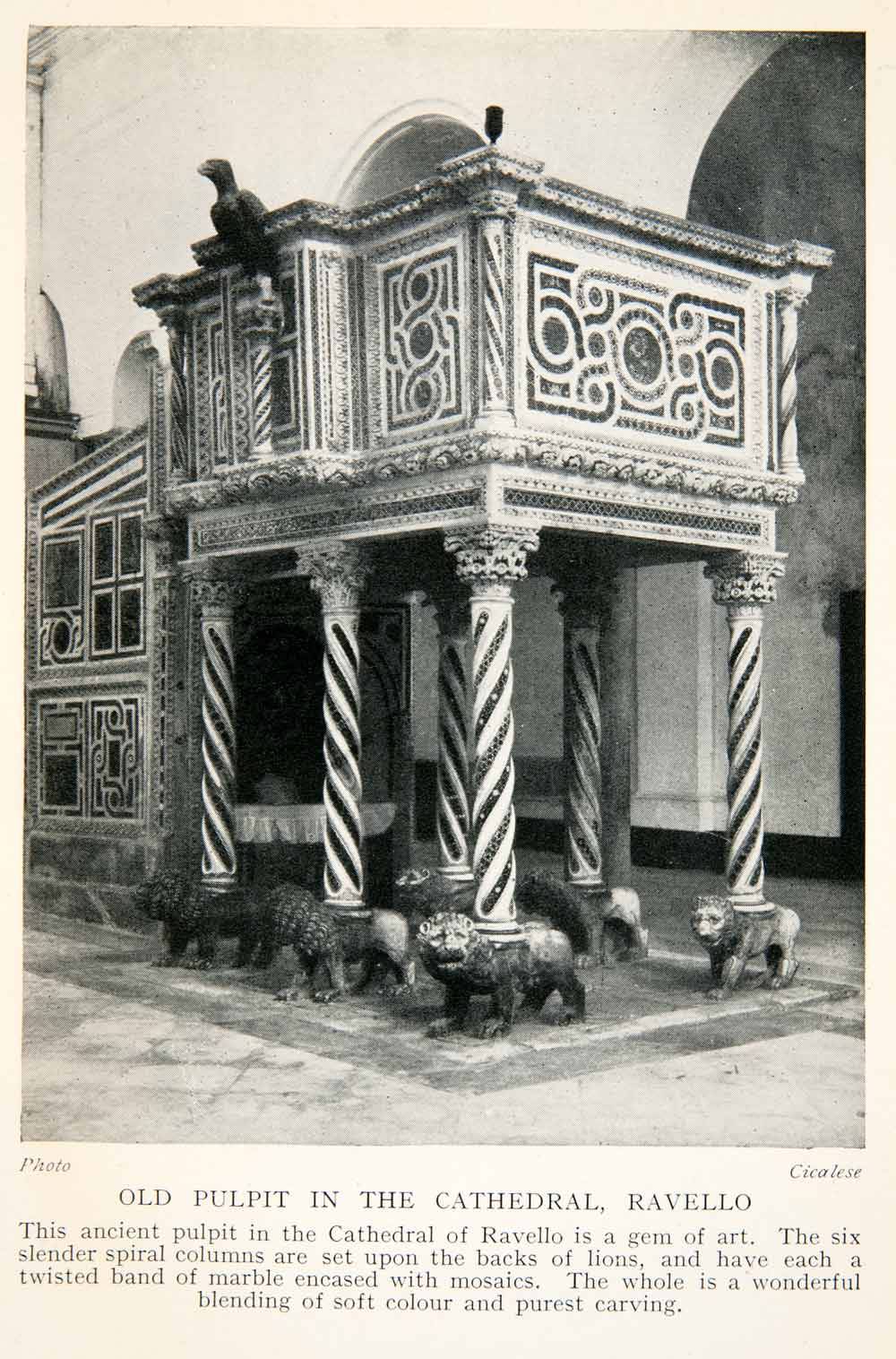 This is an original 1928 black and white halftone print of the old pulpit taken from the Cathedral of Ravello, Italy.
