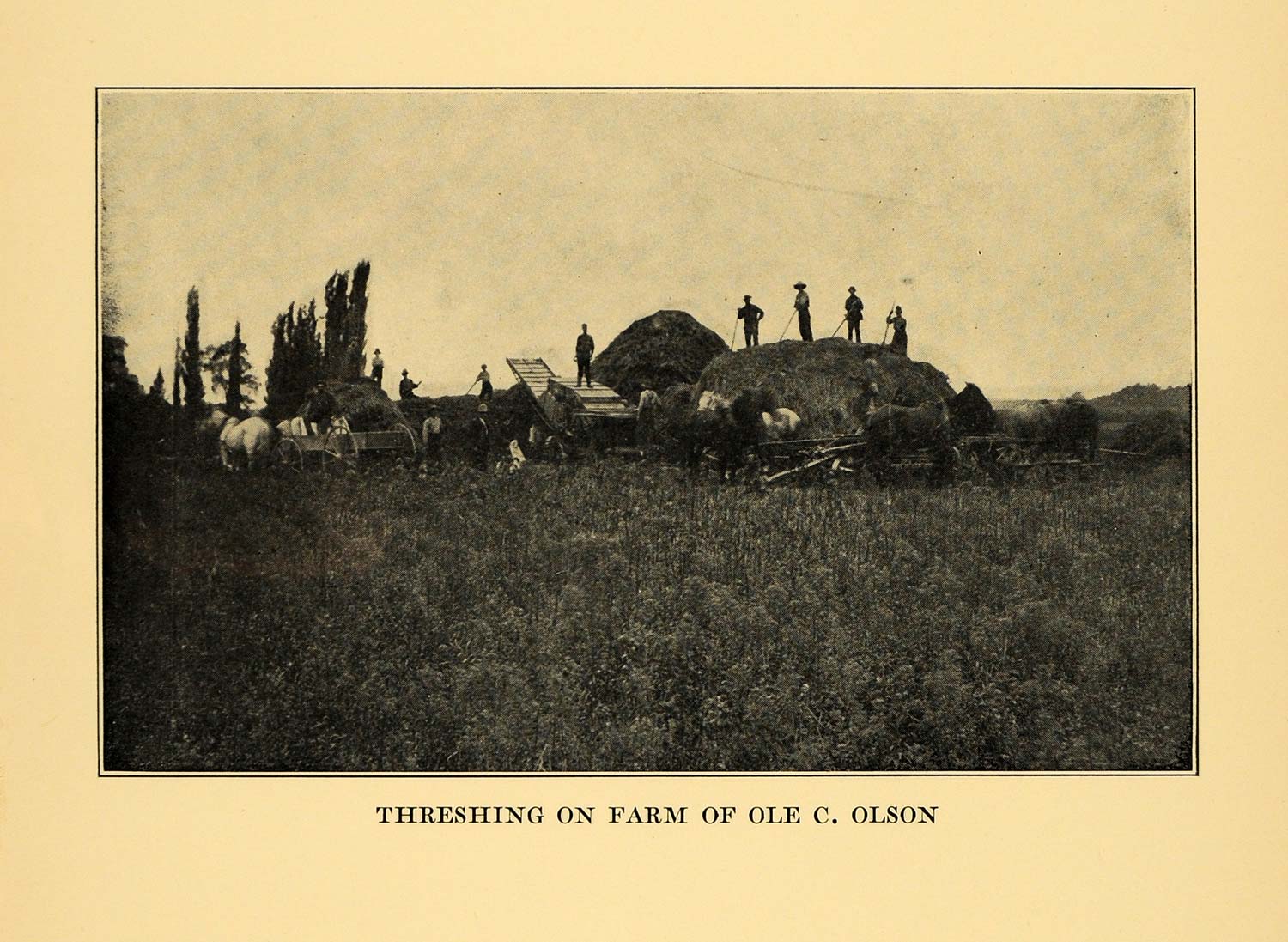 This is an original 1928 halftone print featuring an image of threshing on farm of Ole C. Olson near the village of Rockdale in Dane County, Wisconsin.