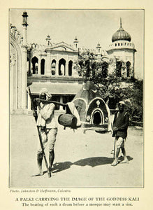 This is an original 1928 black and white halftone print that depicts two Indians carrying a palki which bears the image of the goddess Kali. A pivotal part of Hinduism, Kali is known as the Goddess of time and change, as well as being Lord Shiva's consort.