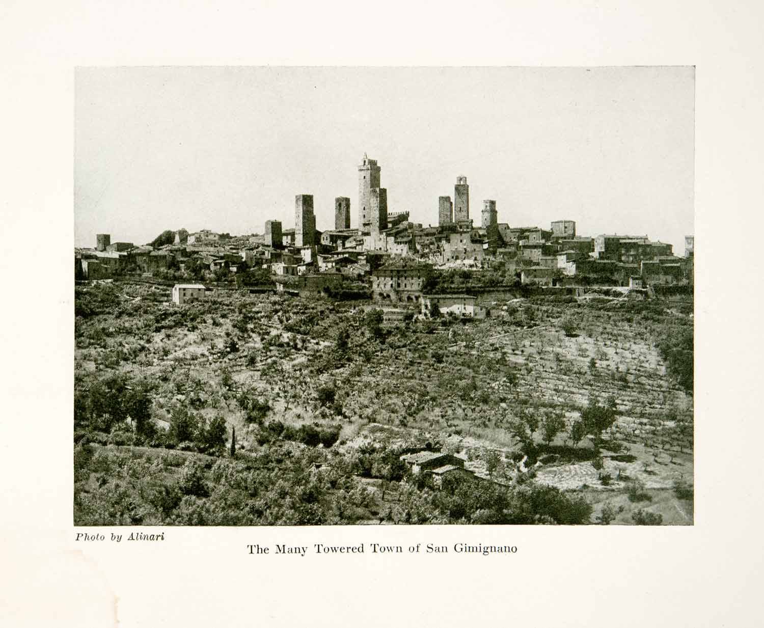 This is an original 1928 duotone halftone print of a historic image of the tower-based cityscape of San Gimignano near Sienna, Italy.