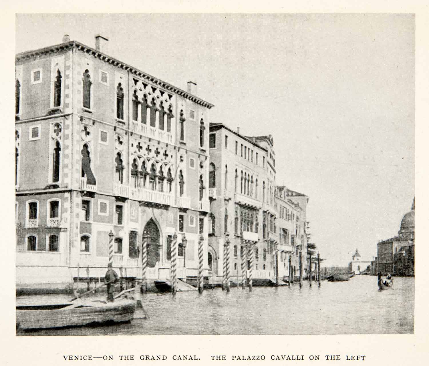 This is an original 1928 black and white halftone print of the Grand Canal running through the city of Venice, Italy. The Palazzo Cavalli can be seen on the left.