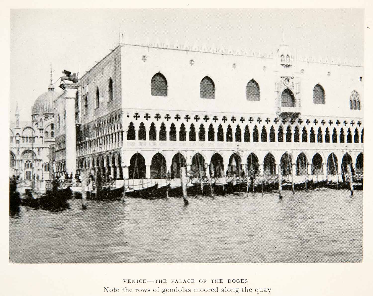 This is an original 1928 black and white halftone print of the Palace of the Doges located along the canals of Venice, Italy.