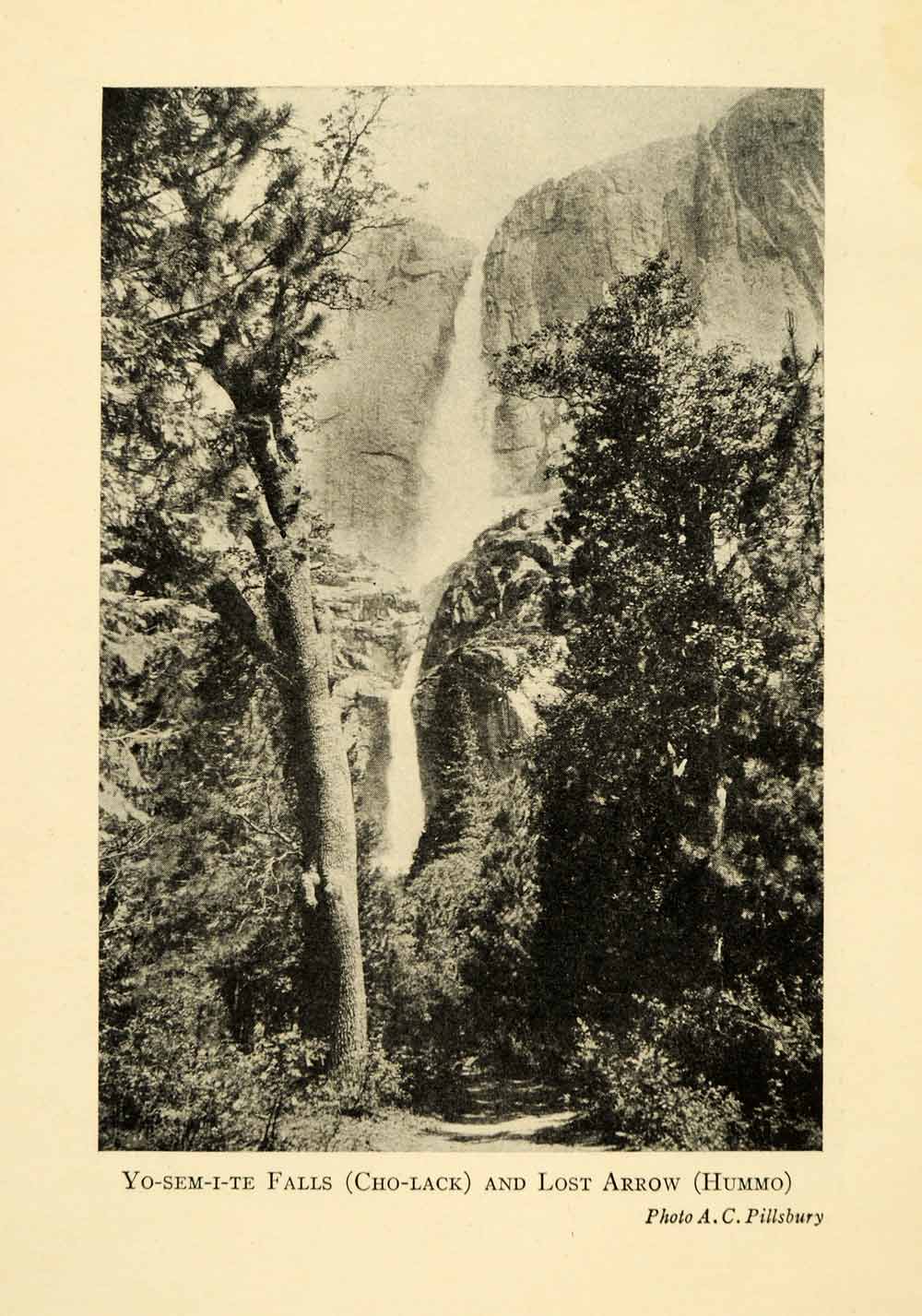 This is an original 1928 halftone print of Yosemite Falls and the Lost Arrow Spire in the Yosemite National Park in California, USA. The spire is listed as one of the 50 best places to hike in the park. The park is known for it's granite cliffs, waterfalls, clear streams, Giant Sequioa groves and biological diversity. A band of Native Americans called the Ahwahneechee lived in Yosemite before anyone had settled in it. The California Gold Rush increased viewer ship of this beautiful area.