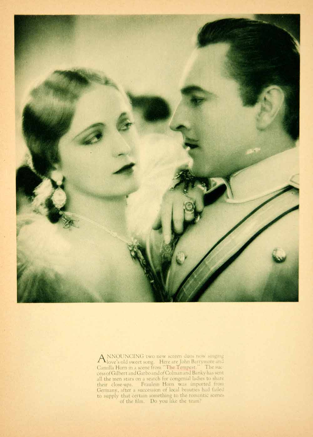 This is an original 1928 duotone rotogravure of motion picture stars, John Barrymore and Camilla Horn in a scene from the 1928 silent movie "The Tempest."