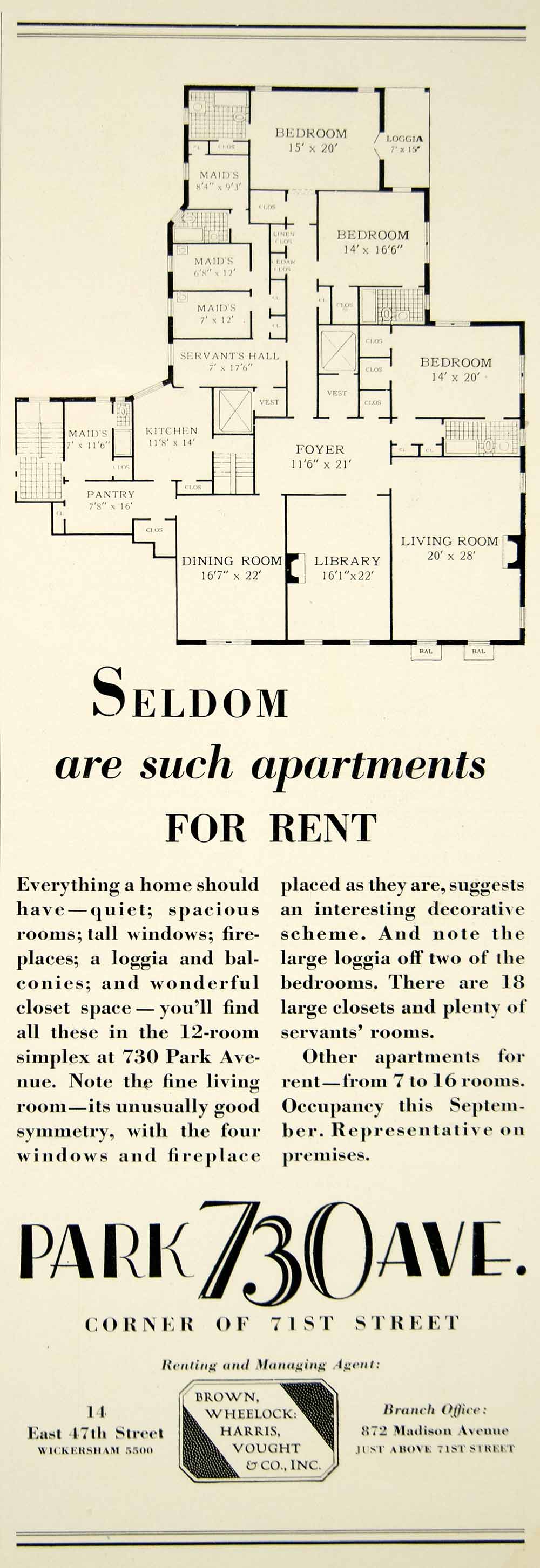 Keywords specific to this image: Vintage Advertising, Avenue, Street, New York, Residence, Real Estate, Property Management, Building, Architecture, Layout, Schematic, Blueprint, Rent, Vought, Company, Incorporated, Bedroom, Loggia, Closet, Maid's Room, Servants Hall, Vestibule, Kitchen, Pantry, Foyer, Dining Room, Library, Living Room, Selling Agent, Broker, Realtor, Simplex, Balcony, Suite