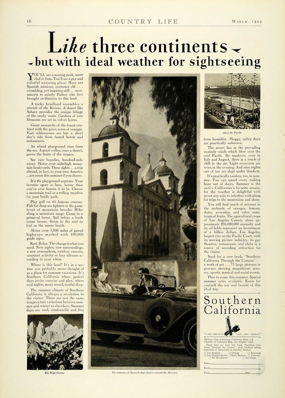 This is an original 1929 black and white print ad for the All-Year Club of Southern California, located in the Chamber of Commerce building in Los Angeles, California, encouraging travel and tourism in the Southern California region.