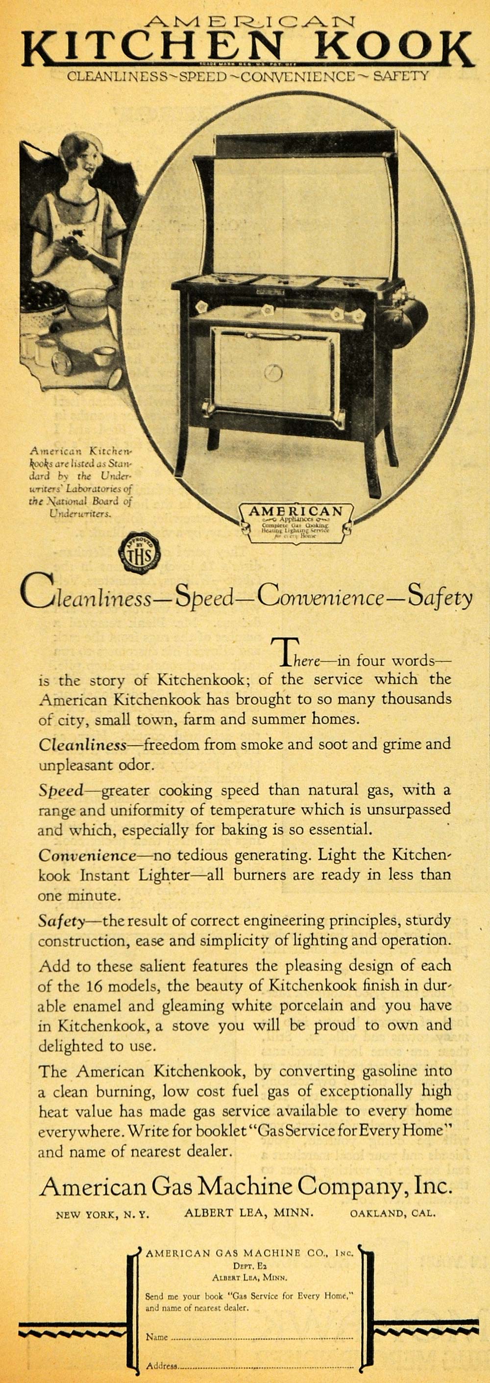 This is an original 1929 black and white print ad for the American Kitchenkook Range for all cooking and baking needs. The American Kitchenkook is a product by the American Gas Machine Company, based in Albert Lea, Minnesota.