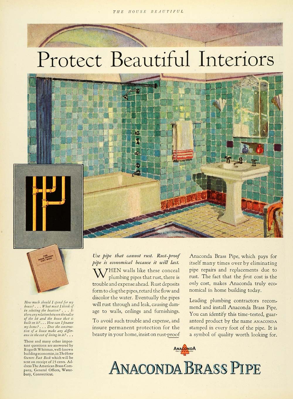This is an original 1929 color print ad for Anaconda Brass Pipe from the American Brass Company of Waterbury, Connecticut.