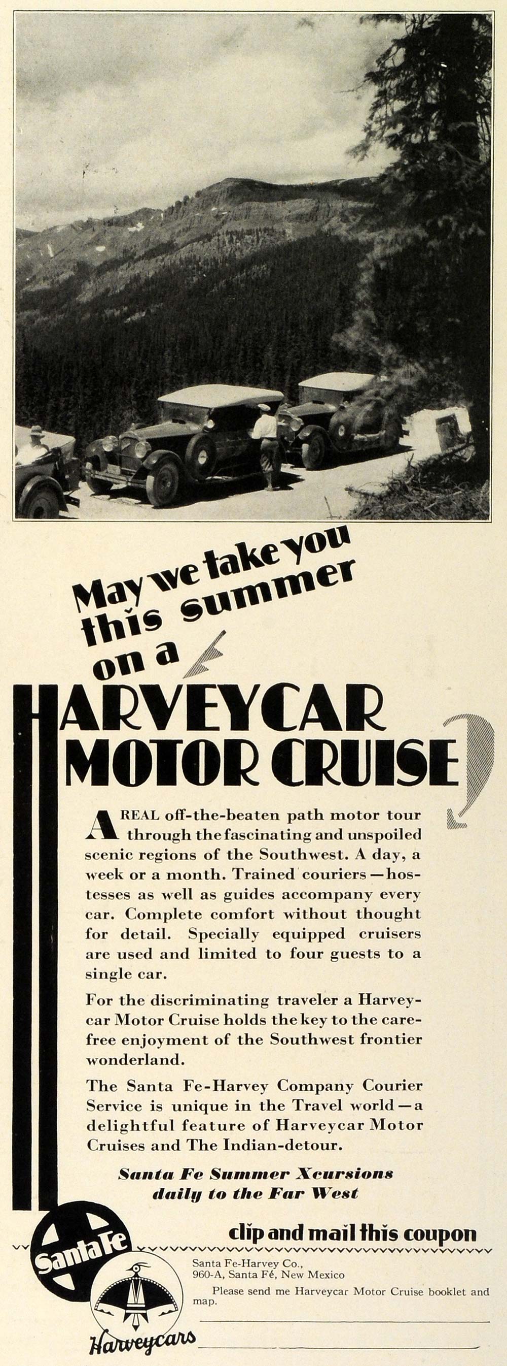 This is an original 1929 black and white print ad for Harveycar Motor Cruises throughout the Southwest United States via the Santa Fe Harvey Company Courier Service.