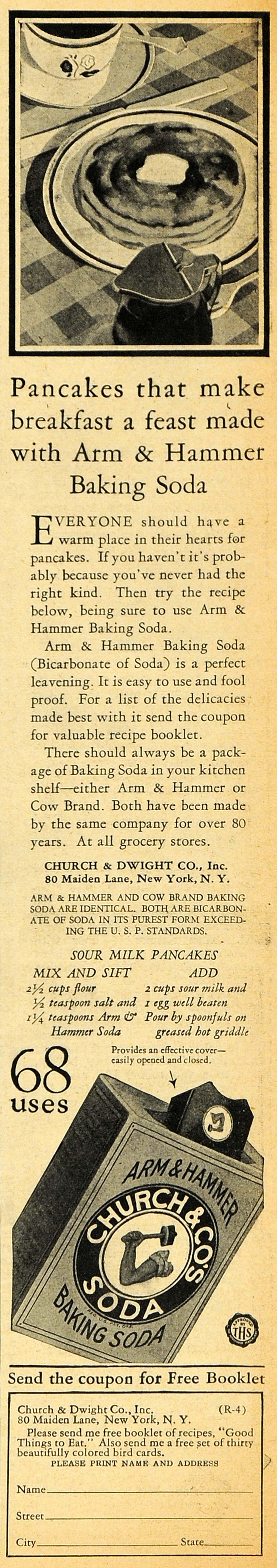 This is a small original 1929 black and white print ad for Arm & Hammer Baking Soda, a product by Church & Dwight Company, located at 80 Maiden Lane in New York City. This ad also features a recipe for Sour Milk Pancakes.