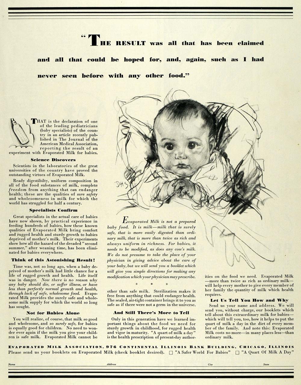 This is an original 1929 black and white print ad for the benefits of Evaporated Milk from the Evaporated Milk Association located in Chicago, Illinois.