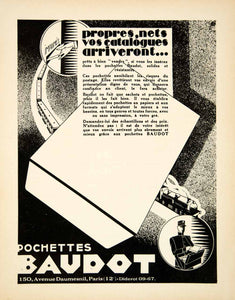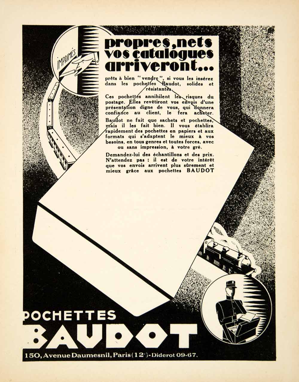 This is an original 1929 black and white print ad for Baudot envelopes. Their offices were located at 150 Ave Daumesnil, Paris.