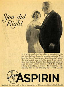This is an original 1929 black and white print ad for Bayer Aspirin, a pain relief tablet for headaches, neuralgia, neuritis, rheumatism and for breaking up the common cold.