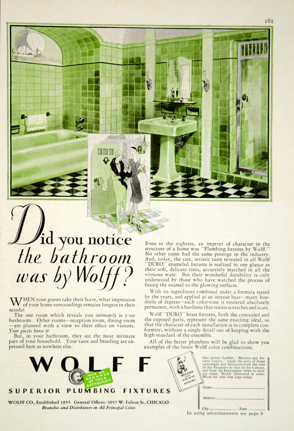 This is an original 1929 two-color print ad for Duro brass bathroom plumbing fixtures that were made and sold by the Wolff Company of 2057 West Fulton Street, Chicago, Illinois (IL) during the Roaring Twenties era. The ad also features an Art Deco style illustration by Bennett.