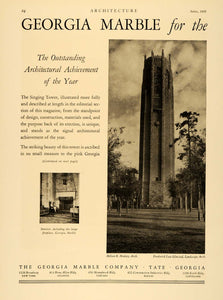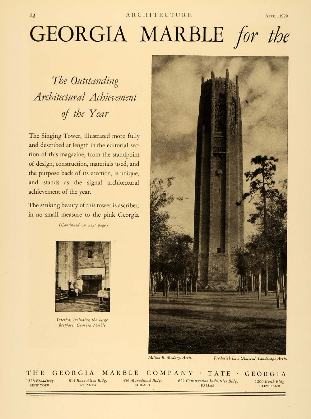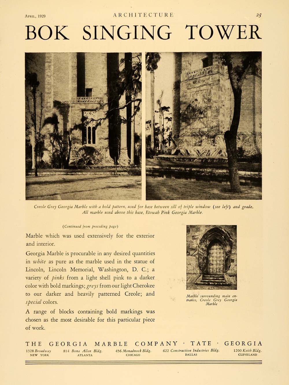 This is an original 1929 black and white print ad for Georgia Marble which was used in building the Bok Singing Tower at 1151 Tower Boulevard, north of Lake Wales, Florida. The marble is by The Georgia Marble Company located in Tate, Georiga. The towers architect was Milton B. Medary and the landscape architect was Frederick Law Olmsted.