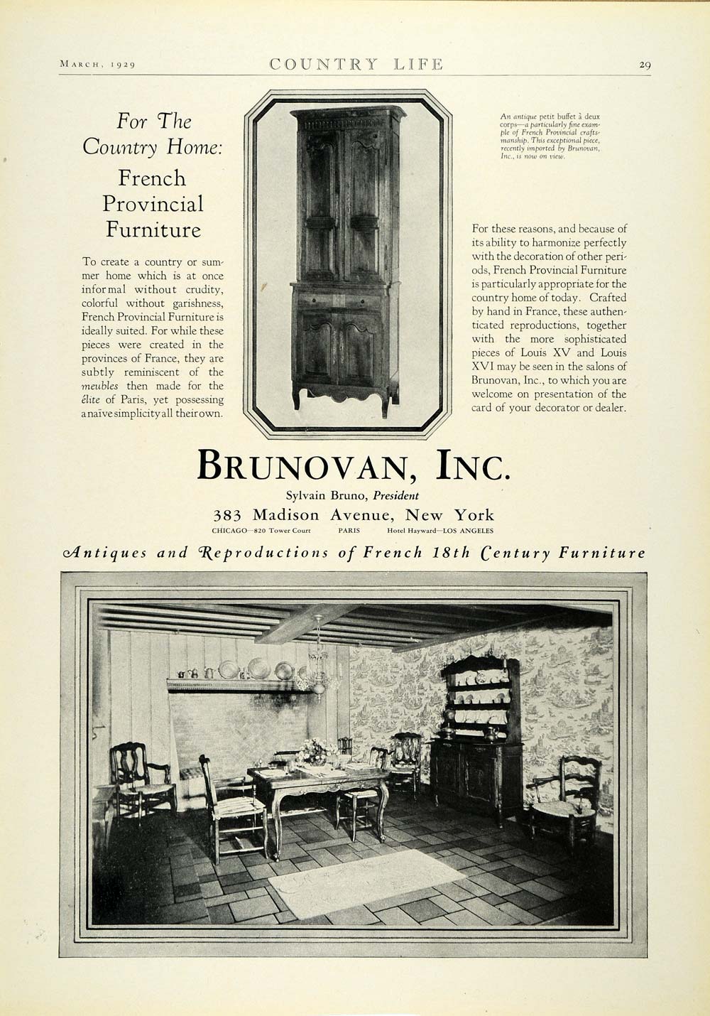 This is an original 1929 black and white print ad for antiques and reproductions of French 18th Century furniture by Brunovan, Inc., located at 383 Madison Avenue in New York. This particular ad features an image of a French provincial petit buffet a deux corps.