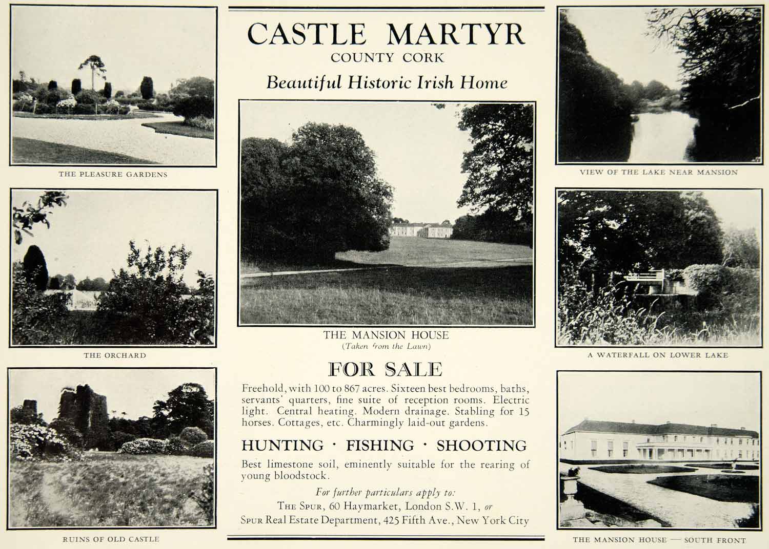 Keywords specific to this image: Vintage Advertising, Irish, Emerald Isle, Pleasure Gardens, Orchard, Ruins, Lake, Waterfall, House, Home, Residence, Manor, Building, Facade, Property Management, Lawn, Grounds, Yard, Trees, Foliage, Bridge, Acre, Cottages, Spur, 60 Haymarket London England, New York, Rural, Countryside, Medieval, Fortress
