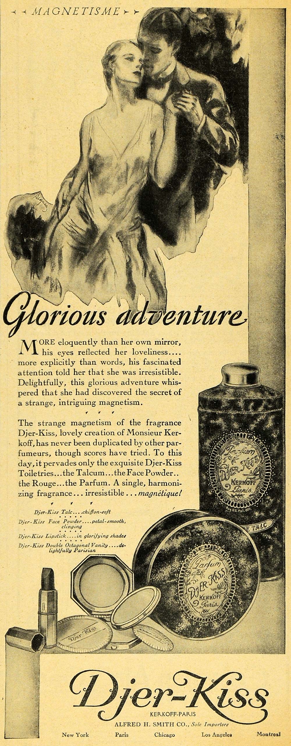 Djer-Kiss Perfumes. Djer Kiss, by Kerkoff, has been around since 1908. The Alfred H. Smith Company of New York was the sole distributor in the United States. In France, Kerkoff was also producing perfume extract, face powder, toilet water, cologne, talcum powder, perfumed sachet, vanishing cream, cold cream, rouge, soap and lipstick.