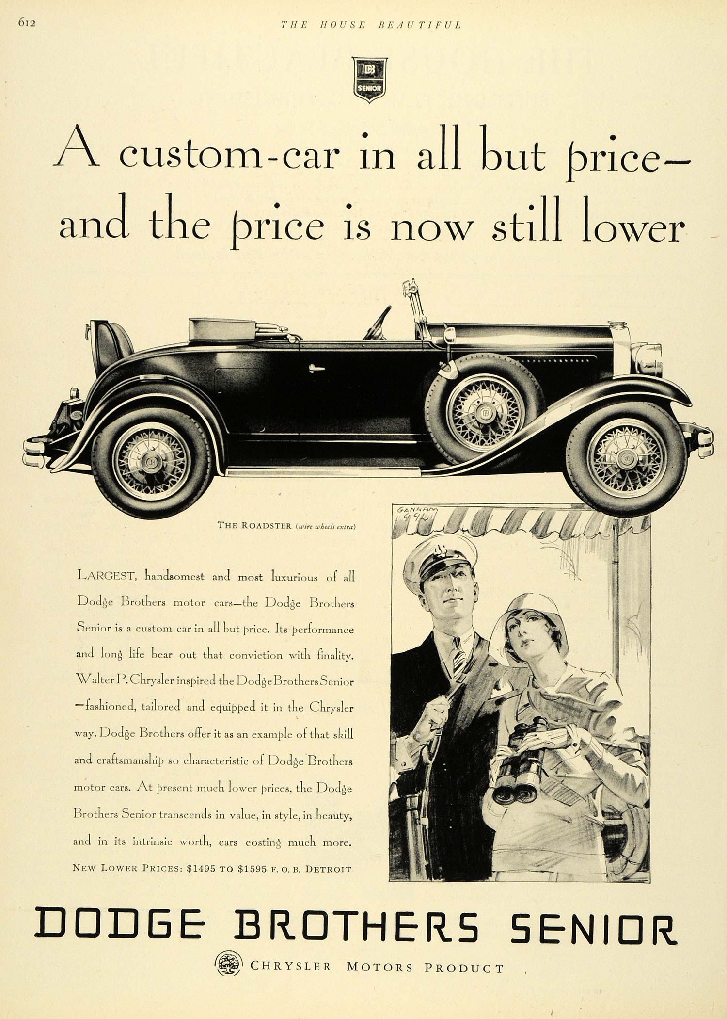 This is an original 1929 black and white print ad for the Dodge Brothers Senior. Shown in the illustration is an image of a couple and the Roadster.