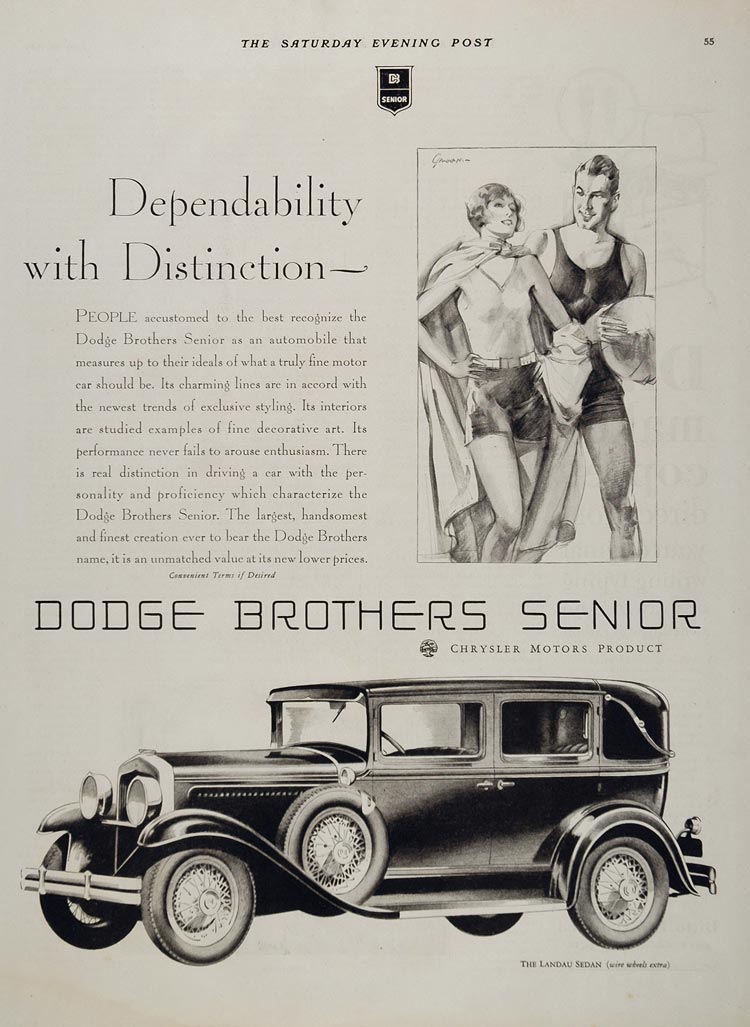 This is an original 1929 black and white print ad for the Dodge Brothers Senior Landau Sedan with a nice vintage illustration of a man and a woman in swimsuits.