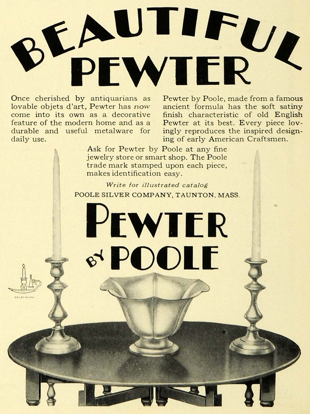This is an original 1929 black and white print ad for pewter decor by the Poole Silver Company of Taunton, Massachusetts.