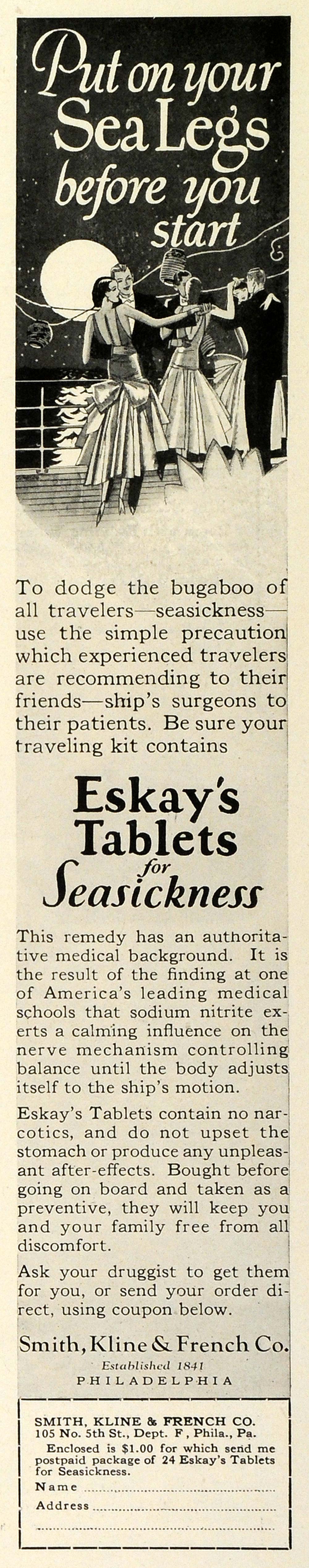 This is an original 1929 black and white print ad for Eskay's Tablets for Seasickness, a product by the Smith, Kline and French Company in Philadelphia.
