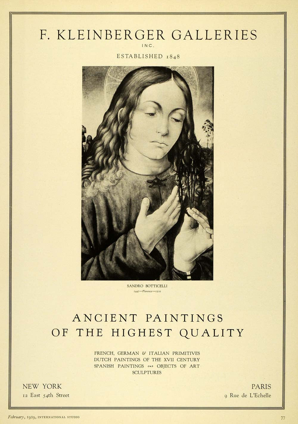 This is an original 1929 black and white print ad for the F. Kleinberger Galleries, located at 12 East 54th Street in New York and at 9 Rue de L'Echelle in Paris. This particular ad features an image of a painting of Sandro Botticelli.