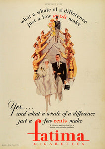 This is an original 1929 color print ad for Fatima Cigarettes from the Liggett & Myers Tobacco Company. Shown in the image are a bride and groom walking beneath an arch of swords held by uniformed soldiers.
