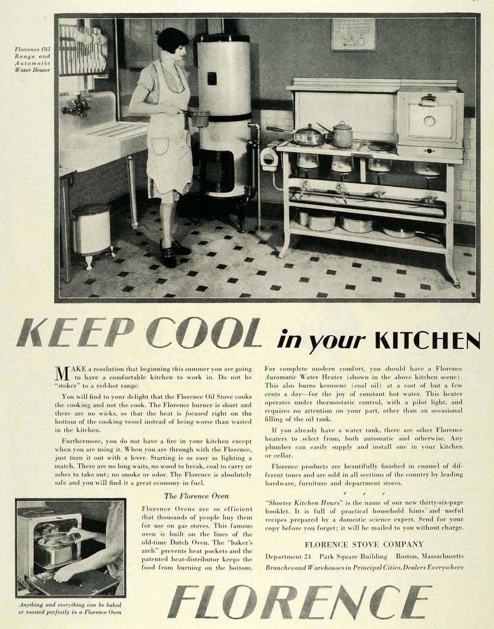 This is an original 1929 black and white print ad for Florence Oven, Oil Range and Automatic Water Heater from the Florence Stove Co. located in Boston, Massachusetts.