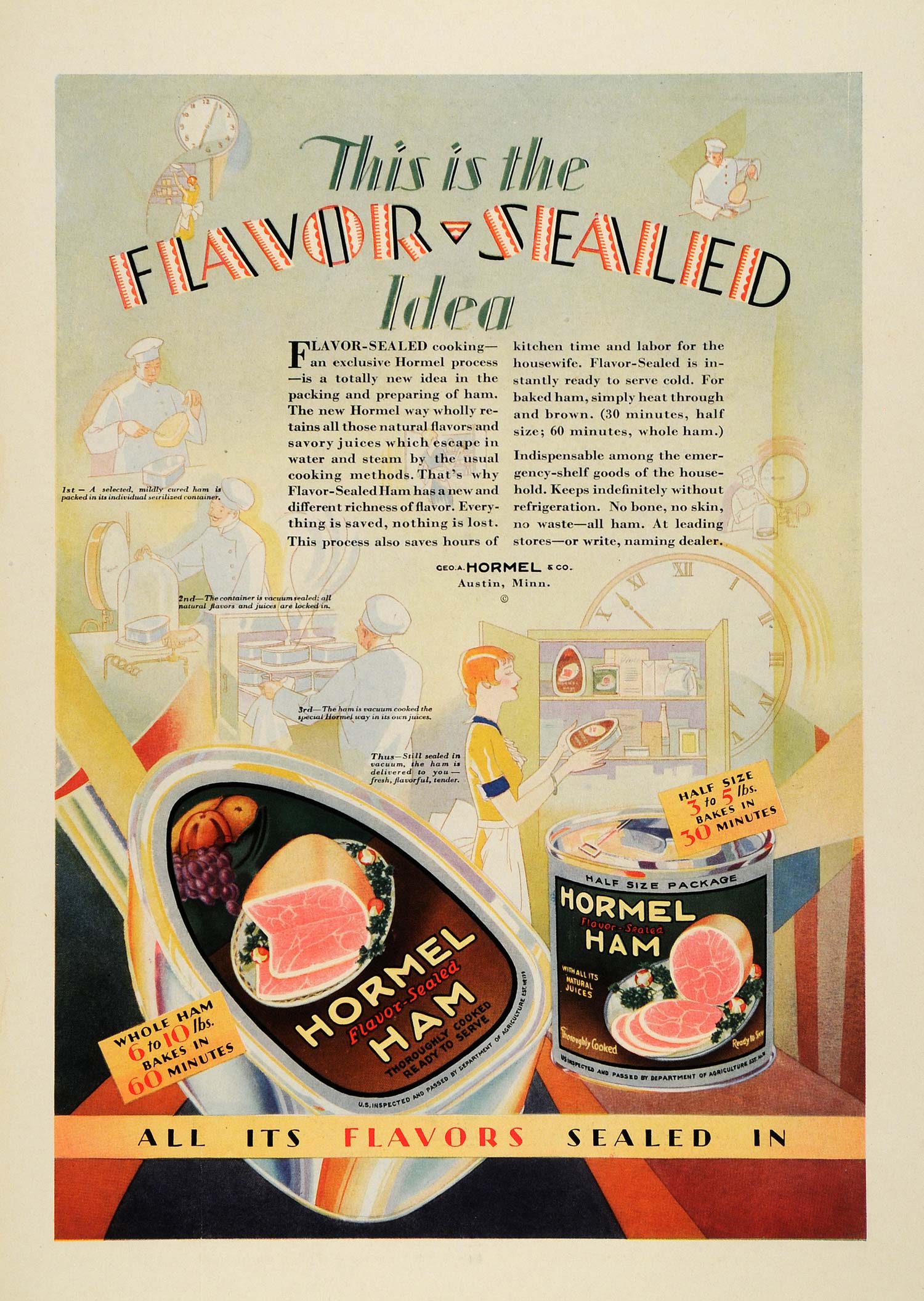 This is an original 1929 color print ad for Hormel Flavor-Sealed Ham, a product by George A. Hormel and Company of Austin, Minnesota.