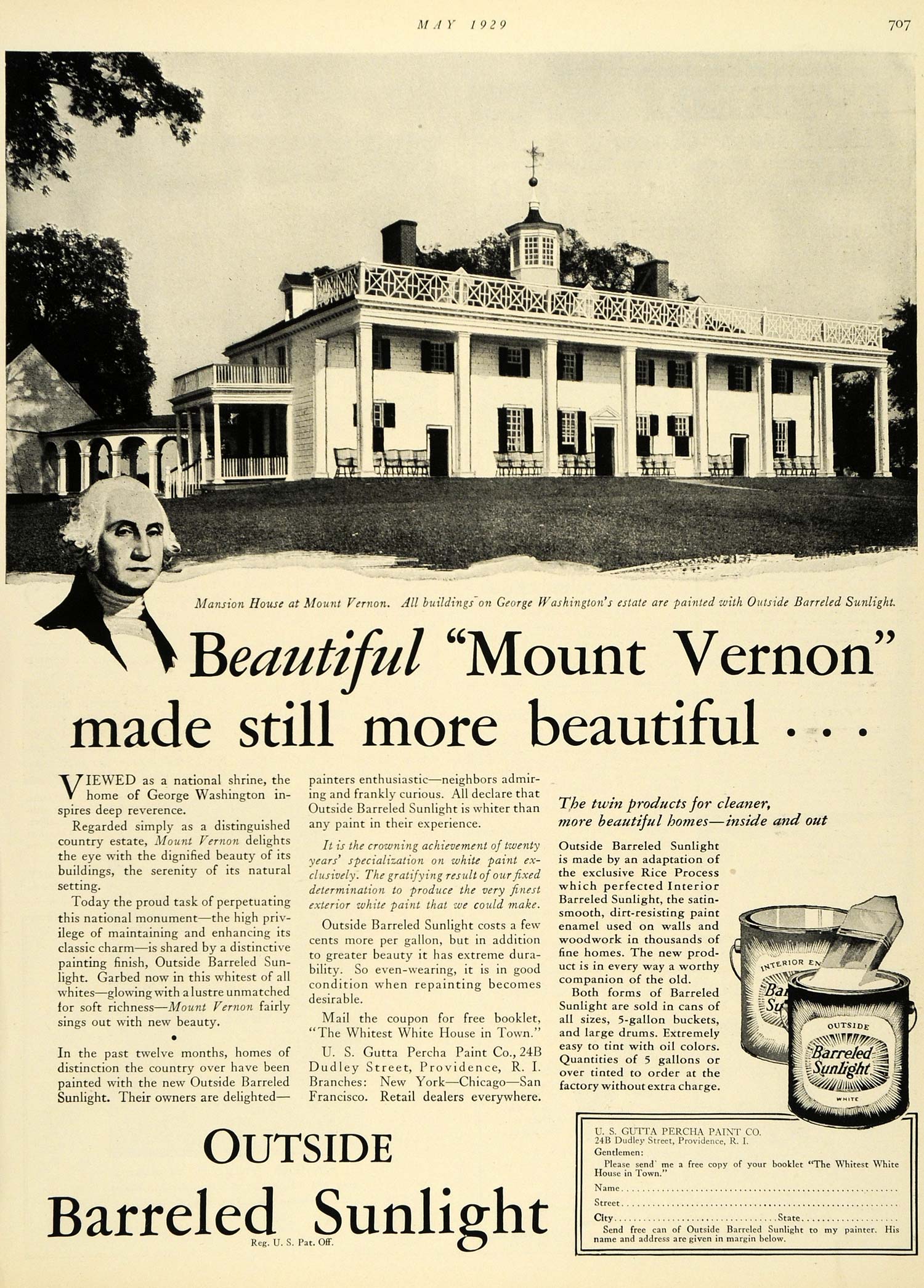 This is an original 1929 black and white print ad for barreled sunlight from the U. S. Gutta Percha Paint Company of 24B Dudley Street, Providence, Rhode Island. Shown in the image is an illustration of Mount Vernon, the home of George Washington.