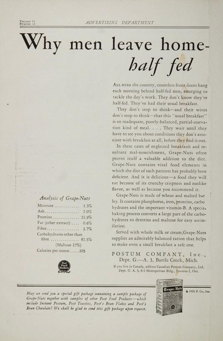 This is an original 1929 ad for Grape-Nuts from the Postum Company of Battle Creek, Michigan. The ad includes a nutritional analysis of Grape-Nuts.